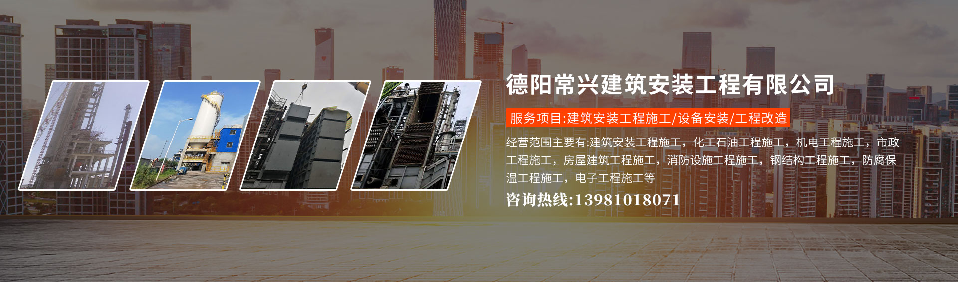 德陽常興建筑安裝工程有限公司,于2014年9月在德陽市工商行政管理局注冊成立。公司位于成渝經濟區重要區域中心城市,中國重大技術裝備制造業基地和全國三大動力設備制造基地之一的德陽。公司現有工程師和技術人員60余名,員工40余人經營范圍主要有:建筑安裝工程施工,化工石油工程施工,機電工程施工,市政工程施工,房屋建筑工程施工,消防設施工程施工,鋼結構工程施工,防腐保溫工程施工,電子工程施工,壓力管道安裝工程施工,壓力容器安裝工程施工,環保工程施工,防雷接地工程施工,中藥提取裝置安裝工程施工,化學合成藥裝置安裝工程施工,自動化控制系統(DCS系統和PLC系統)安裝及調試,銷售:儀表、閥門、建筑五金、機電設備、建筑材料、金屬型材、金屬板材。公司具有上述工程施工承包的相應資質:機電工程施工總承包叁級、石油化工工程施工總承包叁級等,并且全體工作人員上下一心、愛崗敬業、紀律嚴明、苦練內功、技術精湛、內營外拓、信守合同,從而形成了良好的企業美譽度,加大了市場份額,從公司的遠景到戰略定位、從公司企業文化營造到人才引進和培養均實現了長足的進步,公司經營走上了良性發展的軌道,經營業績不斷攀升,創造了眾多優良工程。